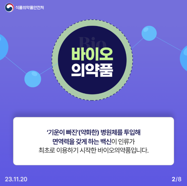 '기운이 빠진(약화한) 병원체를 투입하여 면역력을 갖게 하는 백신이 인류가 최초로 이용하기 시작한 바이오의약품입니다.