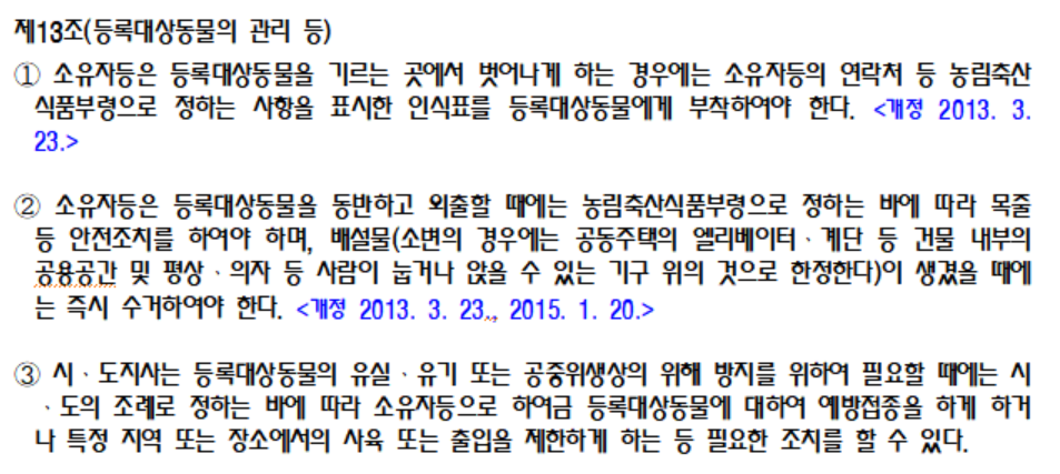 이번에 새로 개정된 규정 이외에 반려견 인식표 부착과 배설물 수거, 예방접종에 관한 동물보호법 시행규칙(농림축산식품부령)도 함께 알아두면 좋을 것 같습니다.