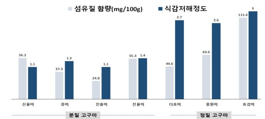 < 고구마 품종별 섬유질 함량 및 식감 저해 정도 >
