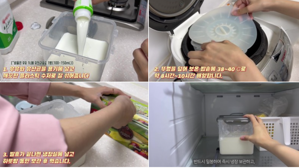 보온 밥솥, 우유, 유산균, 넉넉한 크기의 용기, 플라스틱 숟가락