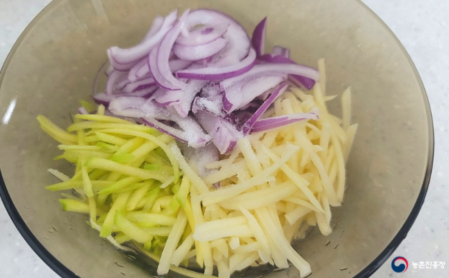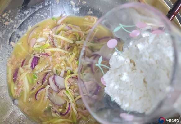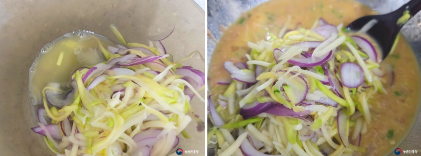 4. 절여둔 감자, 애호박, 양파와 생성된 물도 함께 넣어 섞어줍니다.