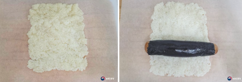 5. 종이 호일 위에 밥을 납작하게 펴고 말아 놓은 김을 올려 말아줍니다.