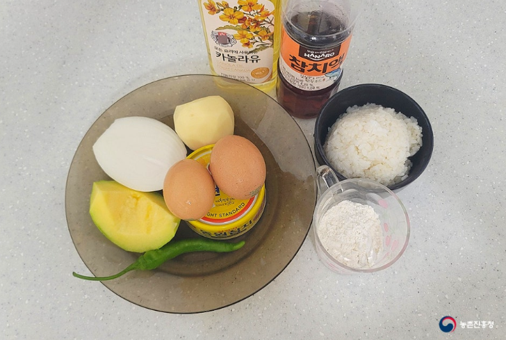 밥 한 공기, 참치 1캔(130g), 달걀 2개, 양파 반개, 감자 반 개, 애호박 1/4개, 청양고추 1개, 밀가루 3숟가락, 소금 1/2티스푼, 액젓 1티스푼