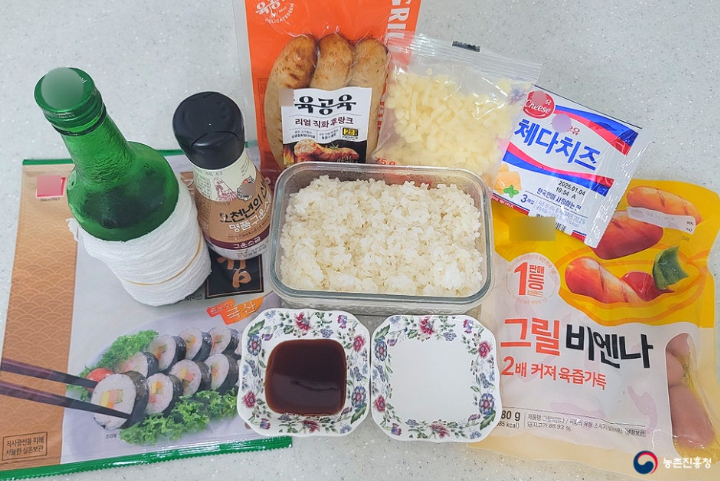 공기밥 3공기, 김밥 김 3장, 일반 소시지 3개(10cm), 비엔나소시지 5개(5cm), 체다치즈 3장, 모짜렐라치즈 75g, 소금 1/2티스푼, 참기름 1숟가락, 굴소스 1숟가락, 물 1숟가락