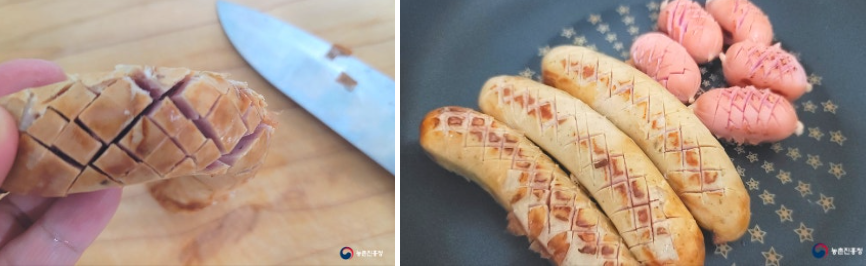 2. 일반 소시지 3개와 비엔나소시지 5개 양쪽에 깔집을 넣고 속까지 노릇하게 구워줍니다.