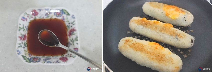 7. 굴소스 1숟가락과 물 1숟라각을 1:! 비율로 섞어 구워진 밥도그 위에 발라 한 번 더 노릇하게 구워줍니다.