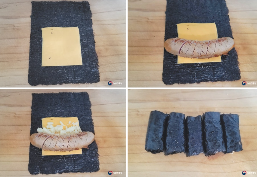 4. 김 위에 체다치즈 3장을 한 장씩 올리고, 그 위에 구운 소시지와 모짜렐라 치즈 75g을 나눠 얹어줍니다.