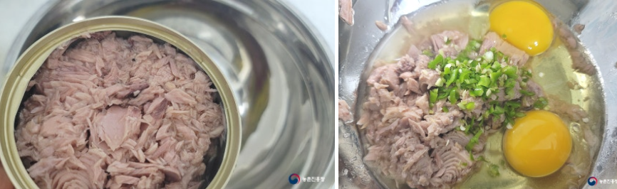 3. 기름을 제거한 참치캔 1개(130g)를 큰 볼에 담은 뒤, 달걀 2개를 깨 줍니다. 송송 썰어 둔 청양고추를 넣어 매운맛을 추가해 줍니다.