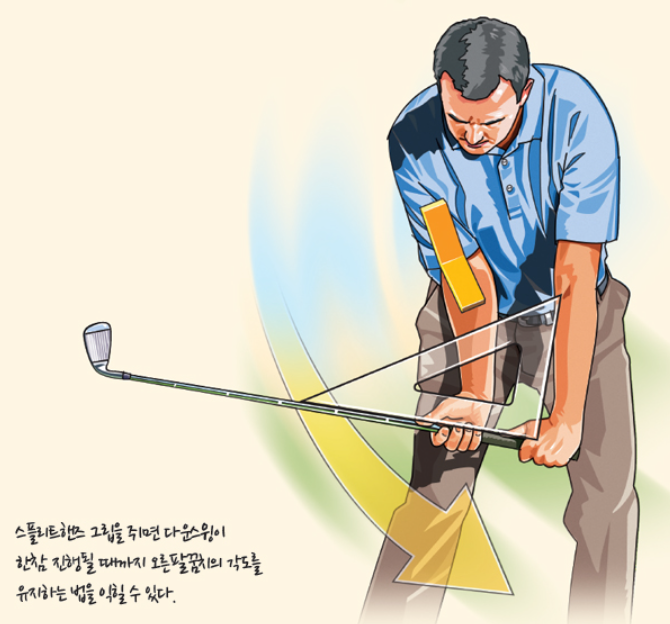 이걸 해결하려면 오른팔이 다운스윙에서 너무 일찍 곧게 펴지는 걸 막을 필요가 있다고 합니다.