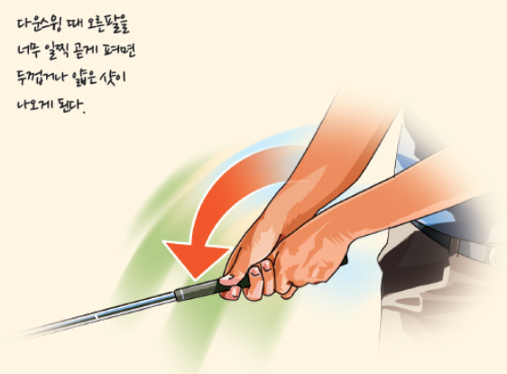 이렇게 조급하게 클럽을 땅에 대는 원인으로는 다운스윙에서 손목의 코킹을 일찍 릴리스하는 걸 들 수 있다고 합니다.