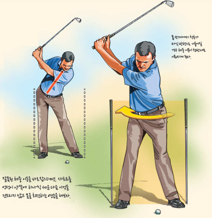 이 오류를 바로잡으려면 양쪽 발 바깥으로 엉덩이와의 간격이 동일하도록 샤프트를 하나씩 세워보고, 백스윙에서 오른 엉덩이를 몸 뒤로 회전할 때에도 양쪽 엉덩이가 이 샤프트와 동일한 간격을 유지해야 한다고 합니다.