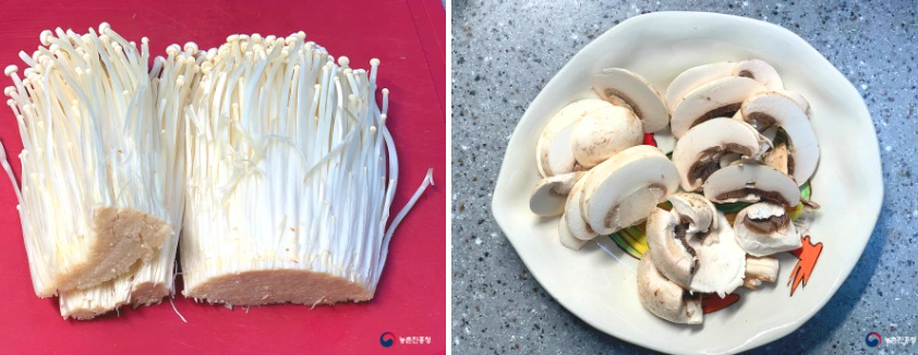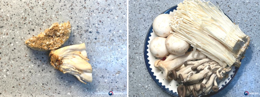 1. 팽이버섯 1봉과 느타리버섯 100g, 양송이버섯 5개, 새송이버섯 100g은 가볍게 물로 헹구고 밑동은 제거해 결대로 잘라줍니다.