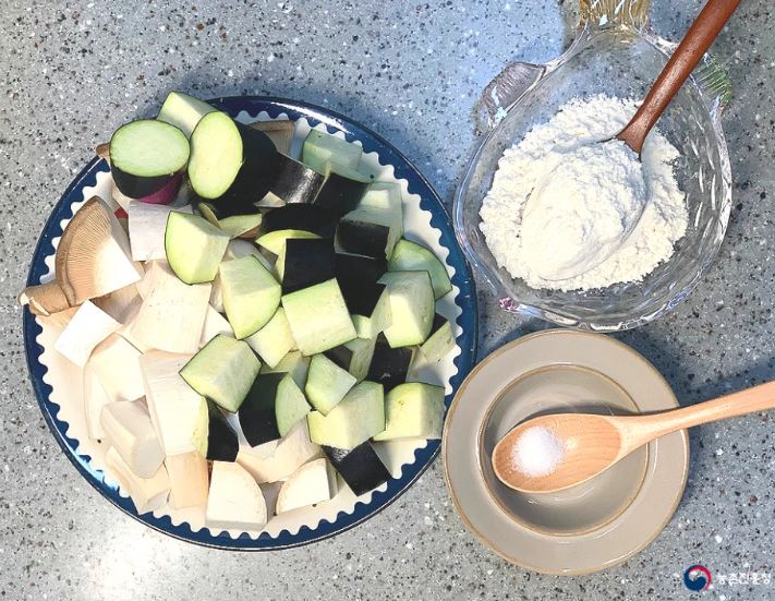 가지 1개, 새송이버섯 2개, 밀가루 100g, 물 150ml, 소금 1/3T