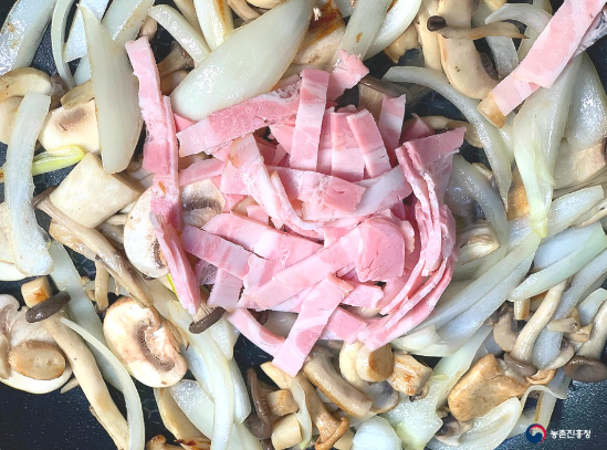 3. 손질해 둔 느타리버섯과 양송이버섯, 새송이버섯, 양파를 먼저 넣고 볶다가 버섯이 살짝 익으면 베이컨을 추가해 노릇하게 익혀줍니다.