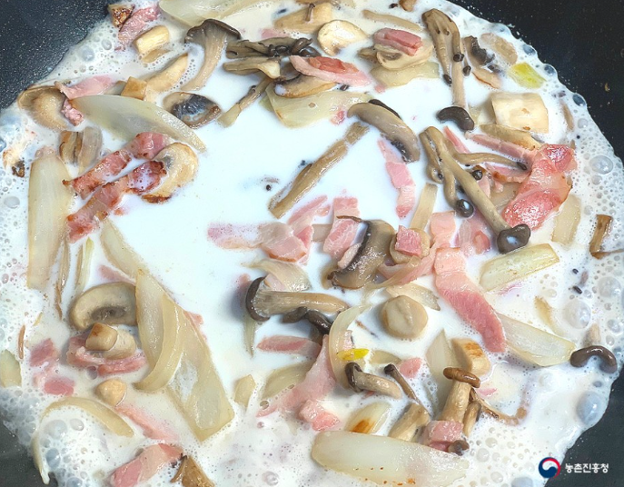 4. 베이컨이 익으면 중간 불로 낮추고 우유 200ml를 부어줍니다.