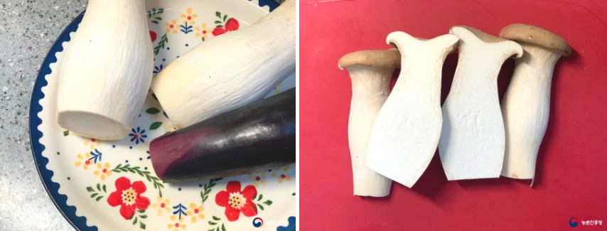 버섯 중 육질이 가장 단단하고 큼직하게 요리했을 때 식감이 좋은 새송이버섯을 선택합니다.