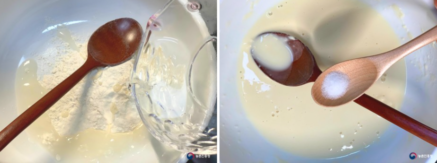 2. 밀가루 200g와 물 150ml을 섞어 튀김옷을 만들어줍니다. 농도에 맞게 물을 추가해 줍니다. 이때 소금 1/3T를 넣어 간해줍니다.