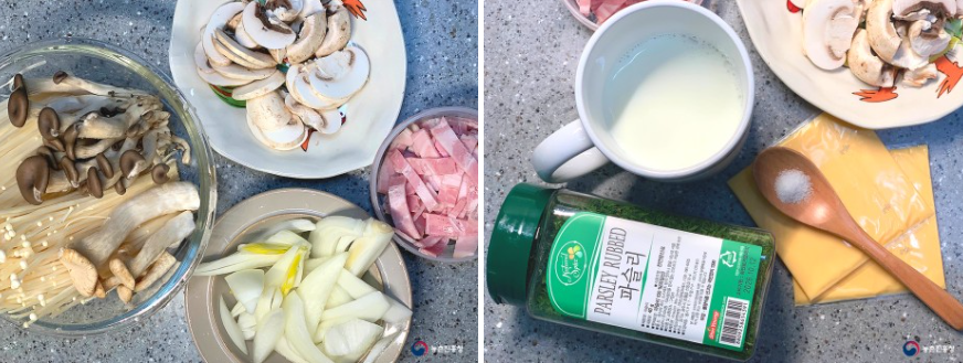 팽이버섯 1봉, 양송이버섯 5개, 느타리버섯 100g, 새송이버섯 100g, 양파 1/2, 베이컨 100g, 우유 200ml, 소금 1/3T, 슬라이스 치즈 2장, 파슬리 약간