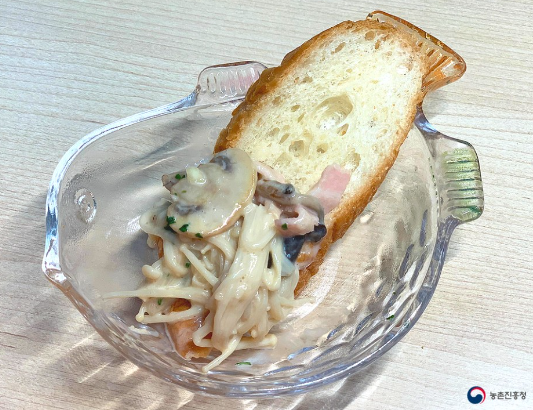 팽이버섯이 면이 되고 네 종류 버섯이 함께 섞여 이색적인 파스타가 탄생됩니다.