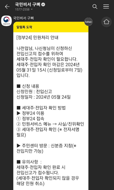 전입 사실 확인을 위해 전입자 전원에게 메시지가 전송된다고 합니다. 정부24에 사실/진위 확인 메뉴에서 확인 절차를 거쳐야 한다고 합니다.