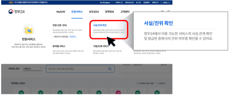 메시지를 확인하였다면, 정부24 사이트 상단 메뉴에서 민원서비스 > 사실/진위 확인' 메뉴를 선택합니다.