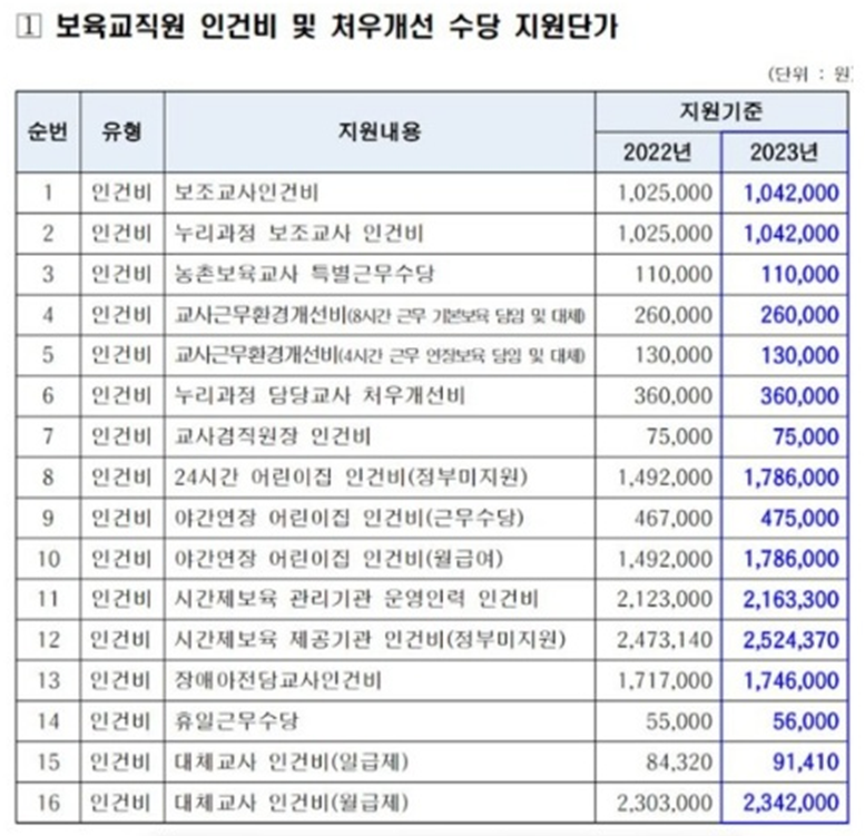 2022년~2023년 보육교직원 인건비 및 처우개선 수당 지원단가