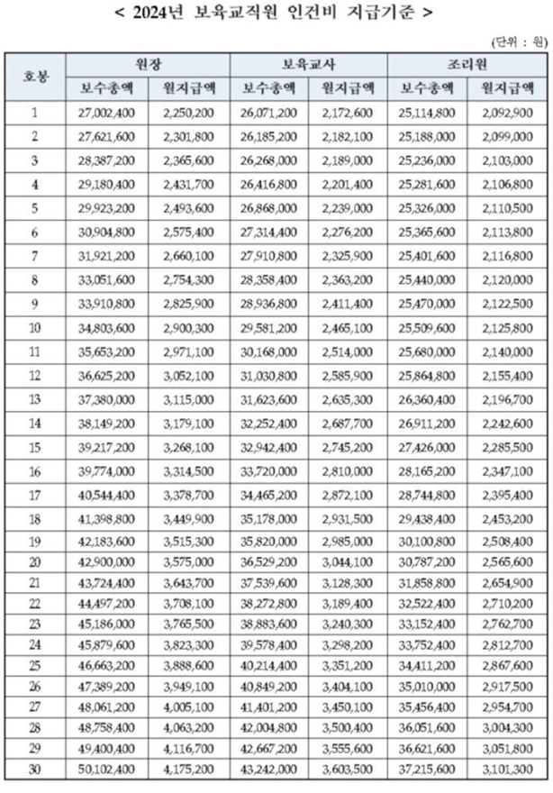23년과 24년을 비교하면 원장은 54,900원이 인상되었고, 보육교사는 73,500원, 조리원은 79,600원이 각각 인상됐습니다.