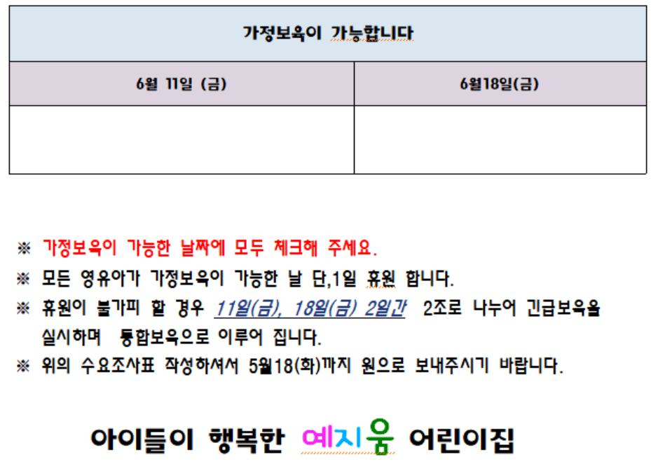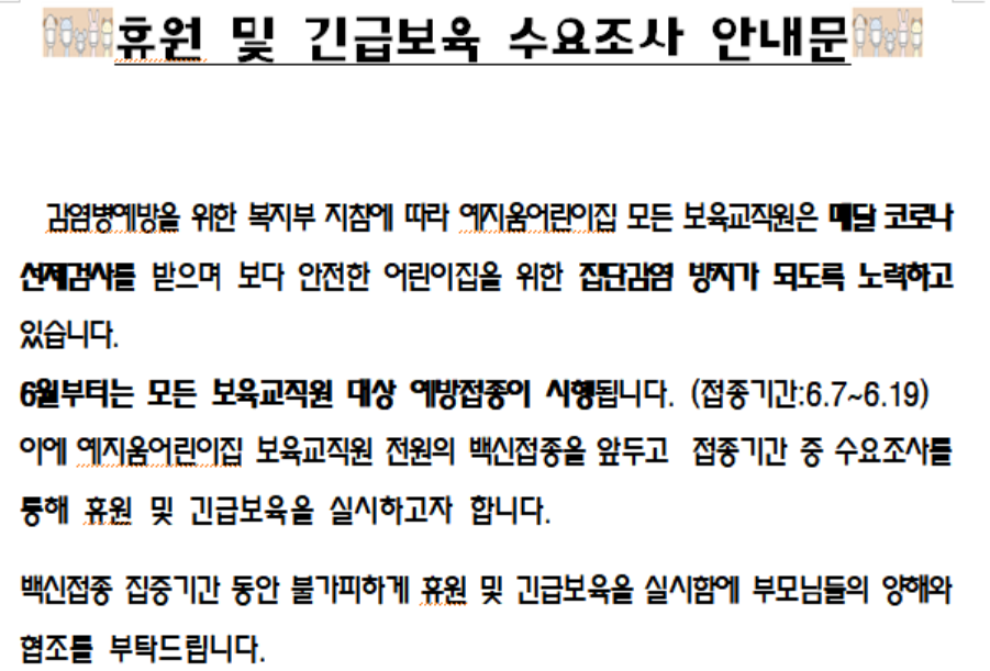보육교사 코로나 백신으로 인한 어린이집 휴원 및 긴급보육 수요조사 안내문