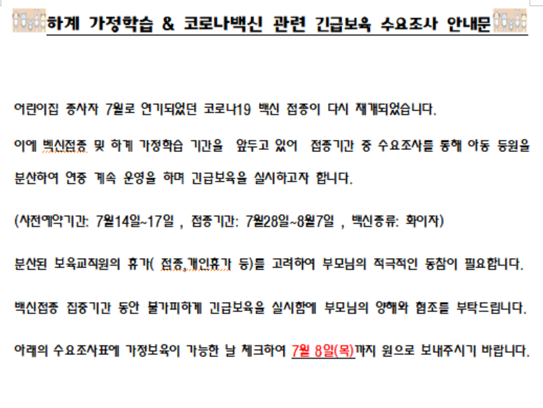 보육교사 코로나 백신으로 인한 어린이집 휴원 및 긴급보육 수요조사 안내문