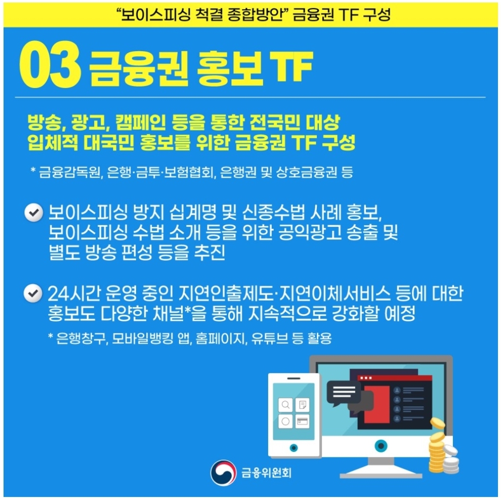 전화로 개인정보 유출, 범죄사건 연루 등을 이유로 계좌번호, 카드번호, 인터넷뱅킹 정보를 묻거나 인터넷 사이트에 입력을 요구하는 경우 절대 응하지 말아야 하며, 특히 텔레뱅킹의 경우 인터넷뱅킹과 달리 공인인증서 재발급 등의 절차가 필요치 않아 타인이 취득 시 사기피해에 취약