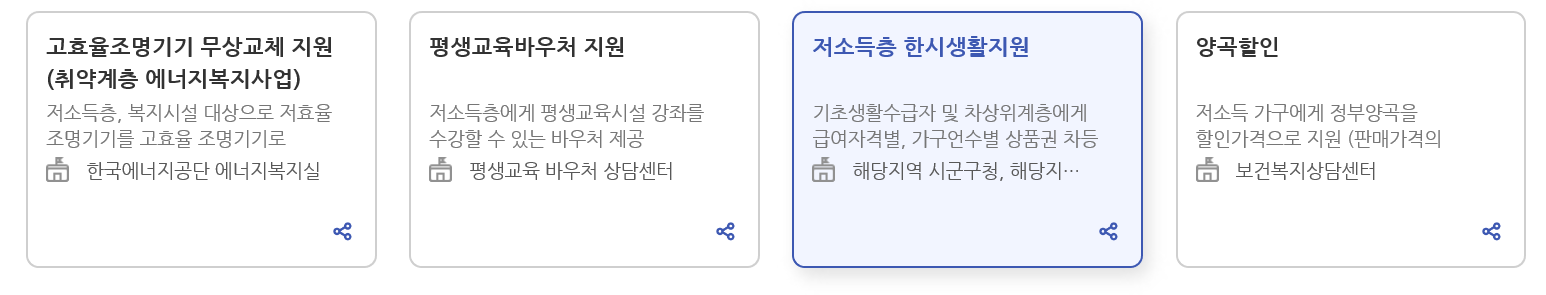 - 공적급여 대상인 기초수급자, 차상위, 한 부모가정 등 저소득가구 대상으로 지원하는 혜택이 다양합니다.