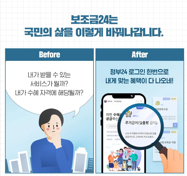 - 다만, 보조금24의 개인의 자격조건 변동이 없을 경우 맞춤 안내되는 서비스 내역이 바뀌지 않을 것입니다.
