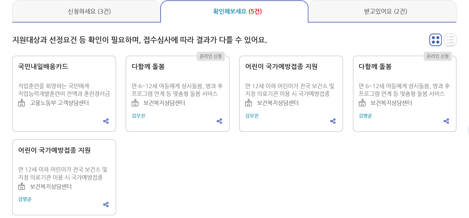 - 현재는 50여종의 자격정보로 '신청하세요'와 '확인하세요'로. 서비스 수급여부 64종으로 '받고 있어요' 정보를 제공하고 있습니다.
