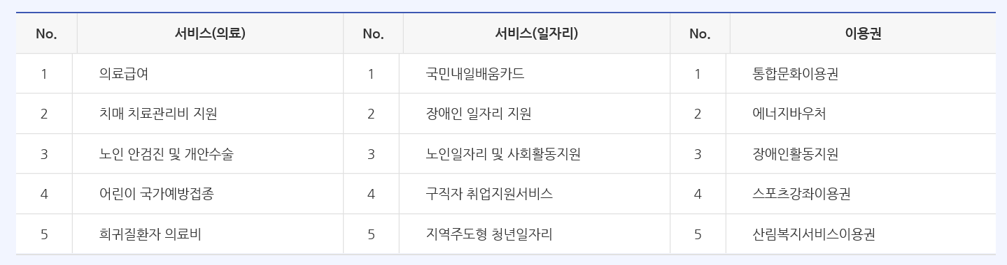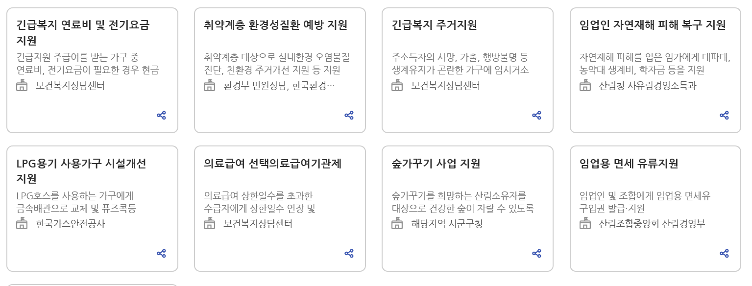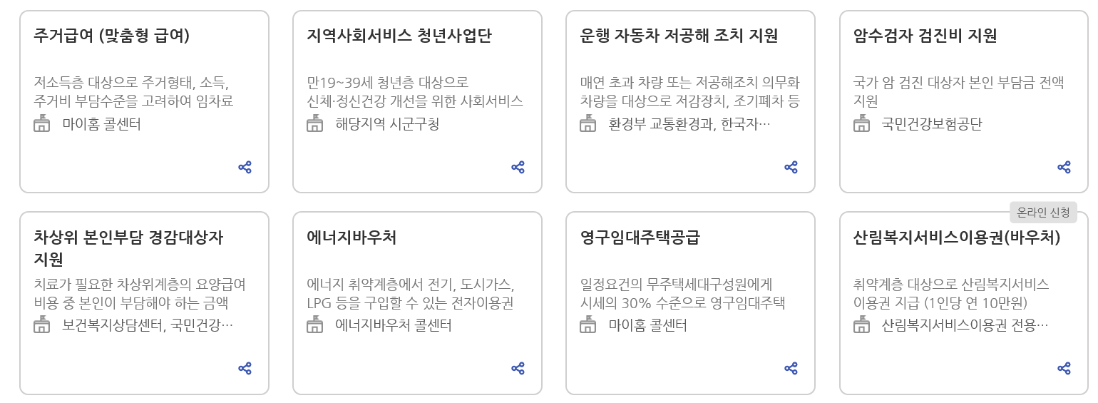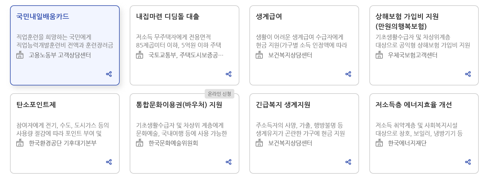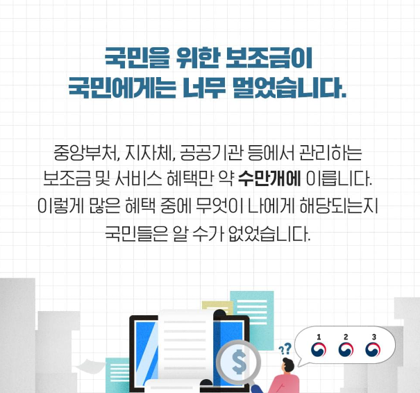 - 현재는 21년도 중앙부처 사업기준으로 개인이 현금, 현물, 바우처 등 정부가 지원하는 혜택 305종을 대상으로 안내하고 있으며,