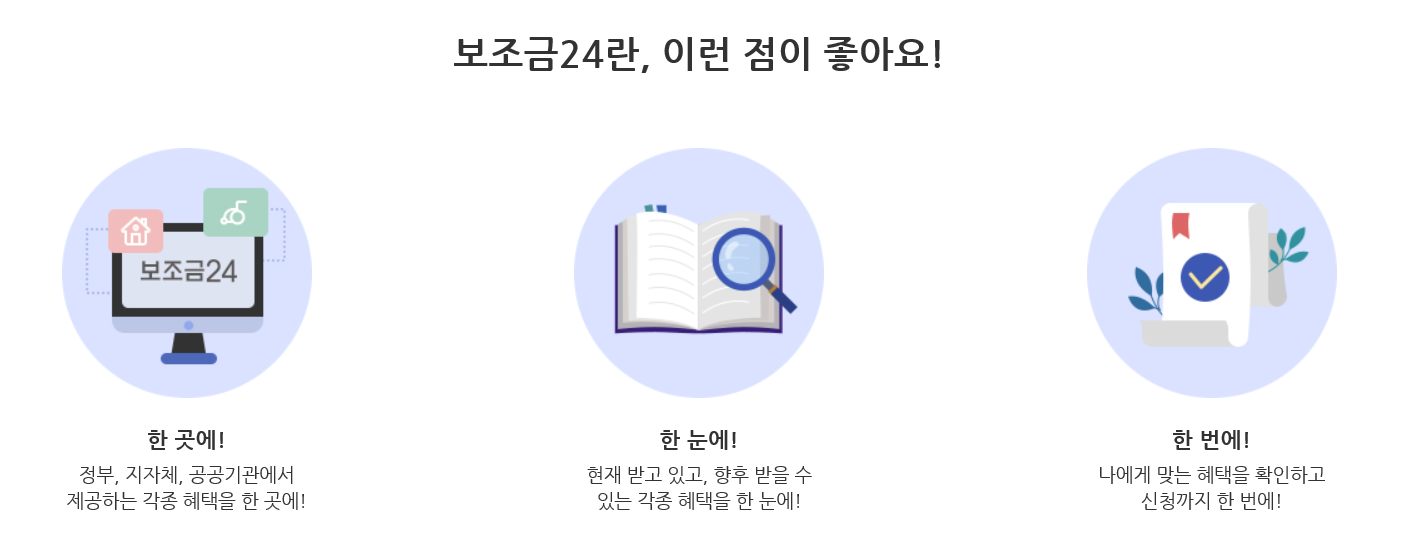 복지분야의 서비스를 온라인에서 안내하고 신청하는 누리집이 복지로(복지멤버십)이라면, 보조금24는 복지분야뿐 아니라 고용, 농림, 수산, 보훈 등 전 분야에 걸쳐 개인이 받을 수 있는 모든 서비스(보조금)를 한 곳에서 한 번에 확인할 수 있는 맞춤 안내 서비스입니다.