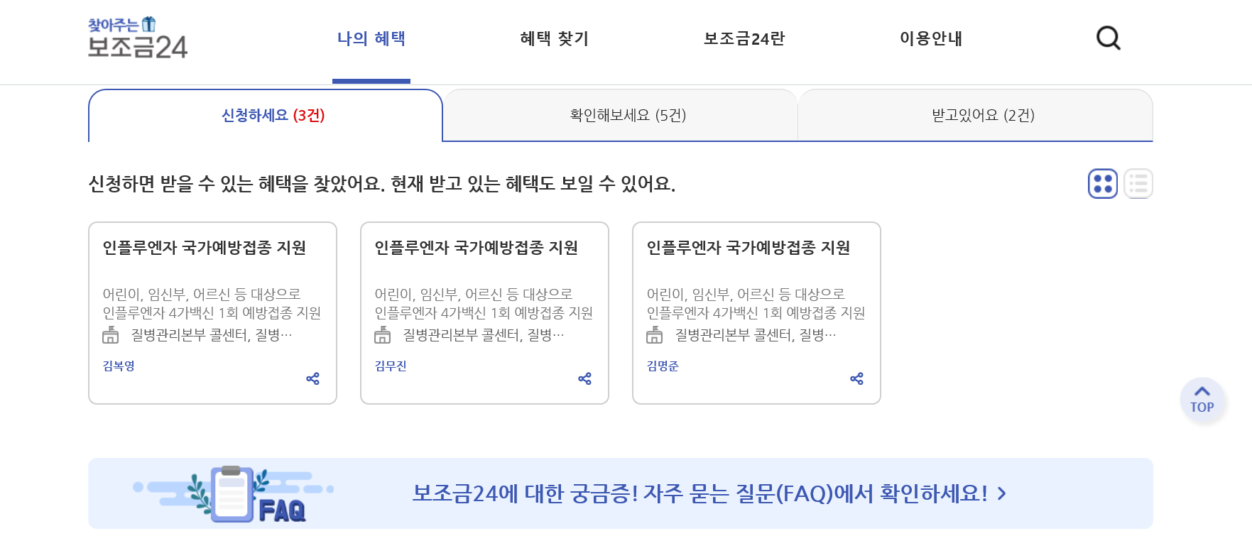 - 서비스 이용 동의한 경우, 보조금24 메뉴 클릭 시 신청하면 받을 수 있는 혜택, 일부 자격조건만 확인되어 접수창구 담당자 확인이 필요한 혜택, 이미 받고 있는 혜택 목록을 확인할 수 있습니다.("신청하세요, 확인하세요, 받고 있어요"로 구분하여 안내)
