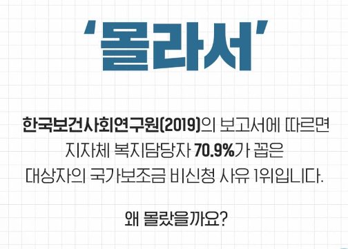- 올해 수급 여부에 대해 정보연계를 확대하고 있어, ’21년 말에는 이미 받고 있는 대상자에게는 받고 있는 혜택으로, 대상은 되지만 신청하지 않은 국민에게는 받을 수 있는 혜택으로 안내되도록 보완될 예정입니다.