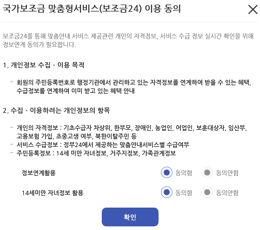 - 보조금24는 개인별 맞춤 안내 서비스를 제공하고 있으며, 개인정보보호법 제22조에 의거 만 14세 미만 아동에 대해서는 부모의 동의를 받아 서비스를 제공 중이며,