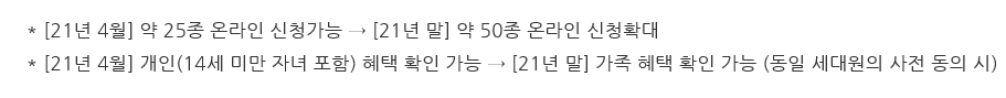 - ’21년 말에는 주민등록상 같은 세대에 거주하는 가족이 이용 동의를 한 경우 가족이 받을 수 있는 혜택까지 확대 제공할 예정입니다.