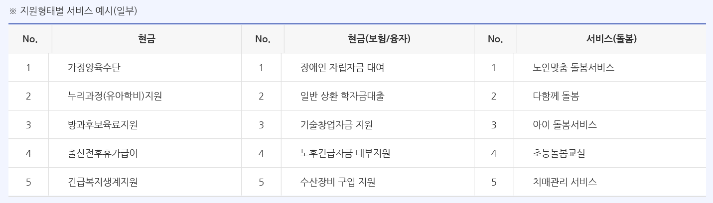 - 지원 형태별로 보면 현금지원(92종), 이용권(27종), 현물지원(23종) 지원이 많고 의료지원, 일자리, 돌봄 서비스도 있습니다.