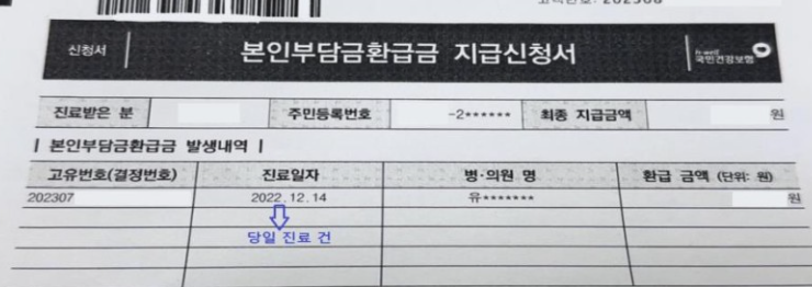 본인부담금환급금 지급 대상자일 경우, 매월 25일경 위와 같은 본인부담금환급금 지급 신청서를 네이버 계정 사용자에게 디지털 안내문 발송 또는 종이 우편물이 대상자 행망 주소로 발송됩니다.