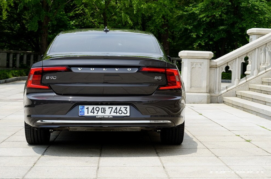 S90 B5에는 2.0리터 4기통 가솔린 터보엔진과 8단 자동변속기, 48V 마일드 하이브리드 조합으로 최고출력 250마력(5400~5700rpm), 최대토크 35.7kgm(1800~4800rpm)입니다. 공차중량 1850kg, 100km/h 정지가속 7.2초, 국내 복합연비 11.7km/ℓ(도심 10.1, 고속 14.6)입니다.