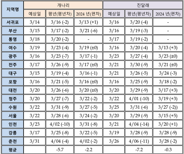 - 진달래는 서귀포에서 3월 16일, 서울에서 3월 20일 개화 예상