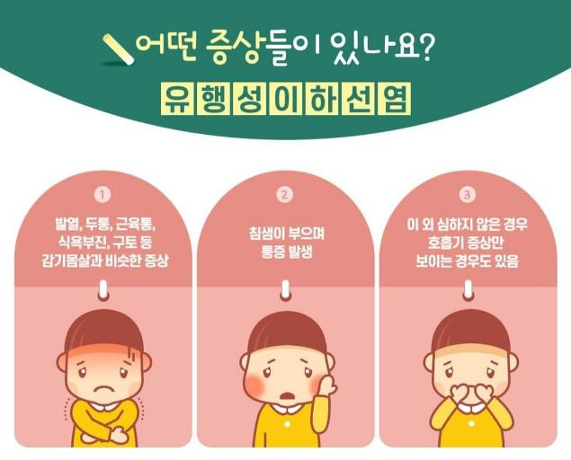 약 2주 정도의 잠복기를 가진 후 발열, 두통, 근육통 등과 함께 귀밑 침샘(이하선)이 붓고 통증을 느끼게 되는 질환으로 사람 간 호흡기 분비물을 통해 감염된다고 합니다.