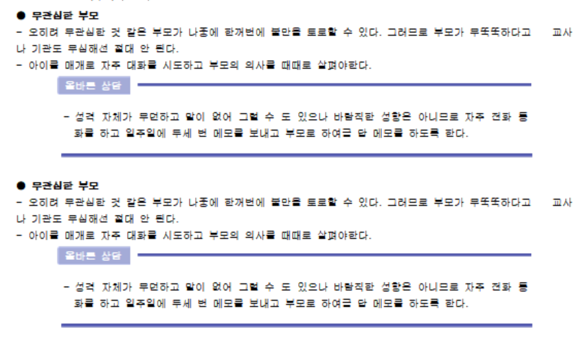 상담전에 미리 읽어두시고 좋은 글은 색펜으로 줄을 그어놓으시면 상담때 부모님께 전달함으로써 분명 좋은 상담이 이루어질것이라 생각이 듭니다.