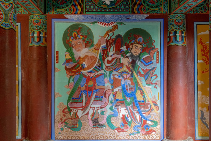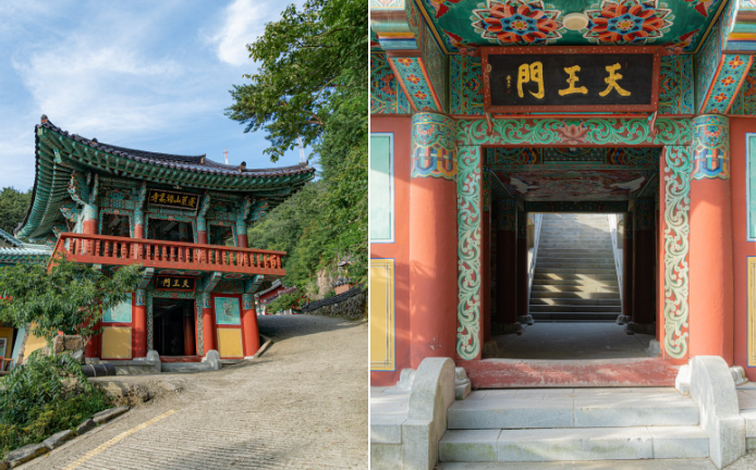 높은 경사로를 조금만 걷다 보면 눈앞에 천왕문이라고 쓰여 있는 것을 확인할 수 있고 복천사는 그 문을 통해 올라갈 수 있습니다. 안쪽에는 사천왕 그림이 있습니다.