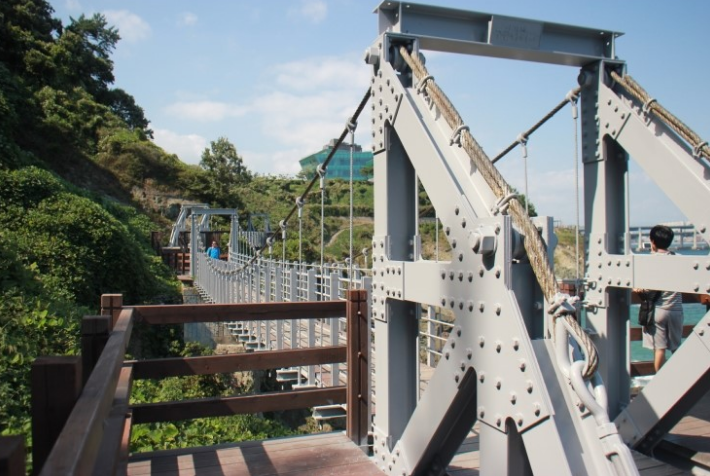 동생말에서 이기대 코스 사이에 있는 구름다리는 말 그대로 절벽 사이 허공 위를 다리로 이어놓은 곳입니다. 사람이 지나갈 때마다 흔들거리게 설계 돼 있어 평소에 경험하지 못한 스릴을 만끽할 수 있다고 합니다. 이기대에서 어울마당까지 구간에는 해녀막사와 작은 해식동굴도 눈에 띕니다. 공룡발자국 화석도 독특한 볼거리라 할 수 있습니다.