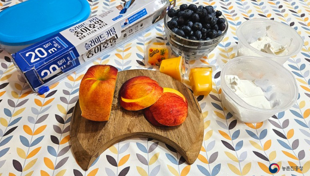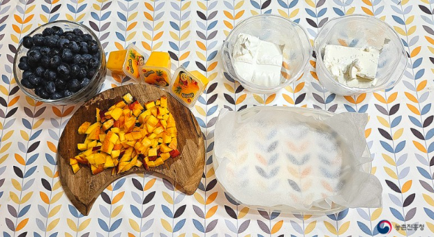 천도복숭아 1개, 그릭요거트 200g, 생망고 젤리 3개, 블루베리 1컵, 견과류 1/2컵, 종이호일