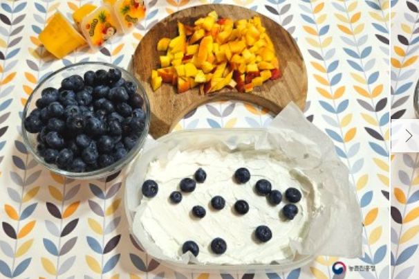 3. 준비해 놓은 천도복숭아와 생망고 젤리, 블루베리 한 컵, 견과류 1/2컵을 예쁘게 올려줍니다.