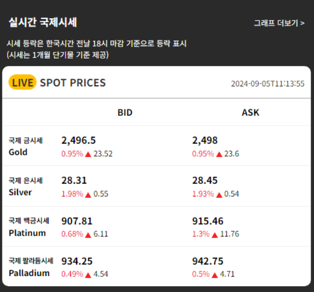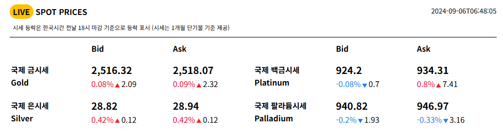 2024년 9월 5일 장마감 기준 한국금거래소 제공 실시간 국제 금시세는 그 전날 마감(한국시간 18시) 대비 0.95% 상승한 트로이온스당 2,496.50달러를 기록하고 있다고 합니다. 국제 은시세는 그 전날 마감대비 1.98% 상승한 트로이온스당 28.31달러를 기록하고 있다고 합니다.